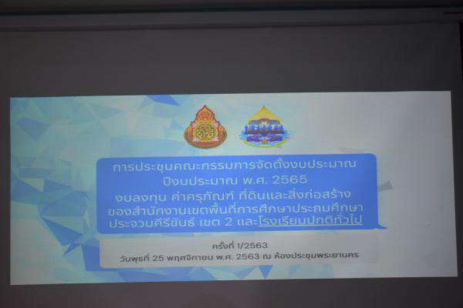 วันที่ 25 พฤศจิกายน 2563 เวลา 10.30 น. นายบุญถิ่น มหาสาโร ผู้อำนวยการสำนักงานเขตพื้นที่การศึกษาประถมศึกษาประจวบคีรีขันธ์ เขต 2 เป็นประธานการประชุมคณะกรรมการจัดตั้งงบประมาณ ปีงบประมาณ พ.ศ. 2565 งบลงทุน ค่าครุภัณฑ์ ที่ดินและสิ่งก่อสร้าง ของสำนักนักงานเขพื้นที่การศึกษประถมศึกษาประจวบคีรีขันธ์ เขต 2 เนื่องจากสำนักงานคณะกรรมการการศึกษาขั้นพื้นฐาน แจ้งให้สำนักงานฯ ดำเนินการพิจารณาคำขอตั้งงบประมาณ งบลงทุน รายการค่าครุภัณฑ์ ของโรงเรียนปกติทั่วไป สังกัดสำนักงานเขตพื้นที่การศึกษาประถมศึกษาประจวบคีรีขันธ์ เขต 2 จำนวนงบประมาณ 2,075.000.- บาท ณ ห้องประชุมพระยานคร ชั้น 2 สพป.ประจวบคีรีขันธ์ เขต 2 S:0